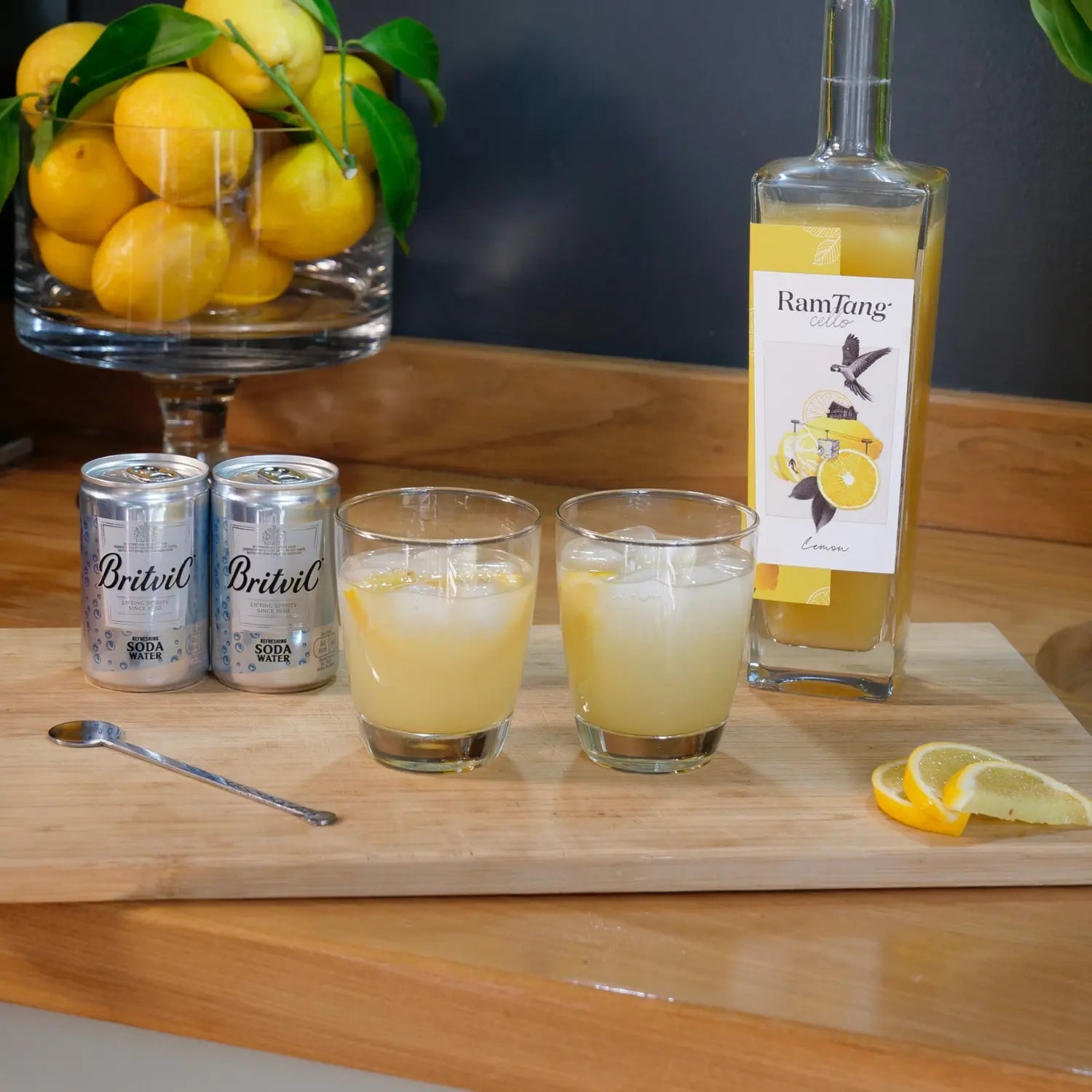 Start by: Filling a glass with ice cubes and gently pour the RamTang' Lemon Cello over it, followed by your soda of choice