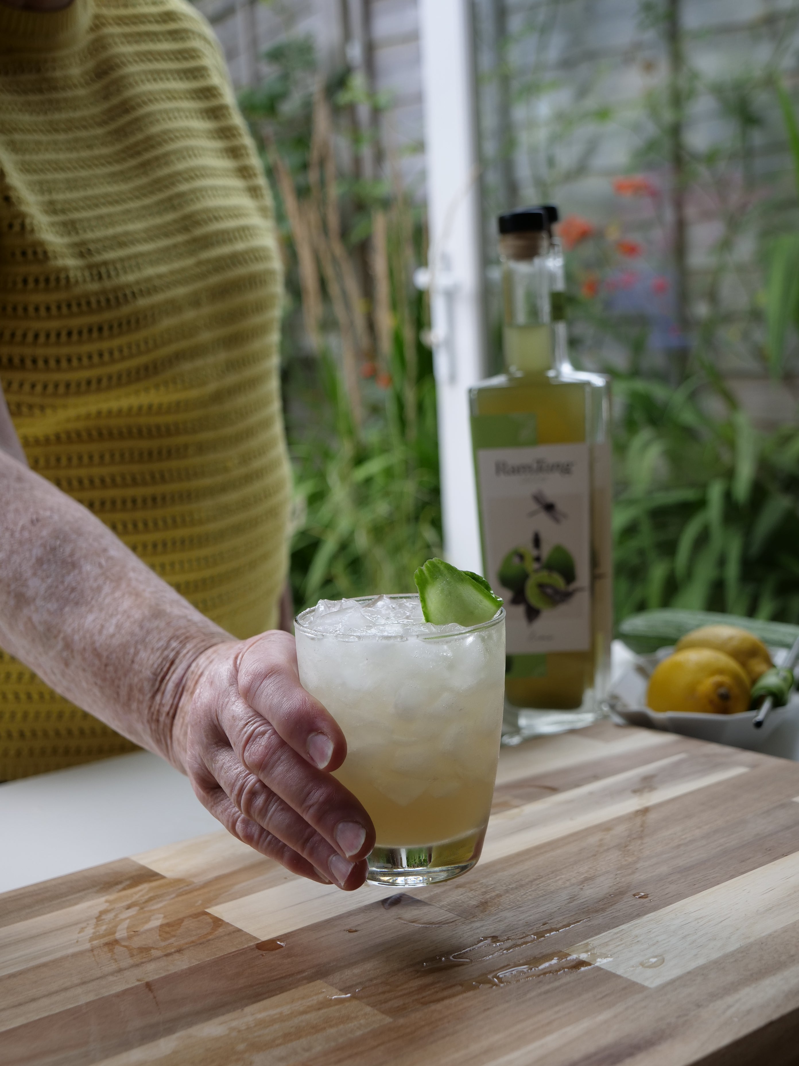 Start by: Filling a cocktail shaker filled with ice, add the gin, RamTang' Lime Cello and elderflower liquor.