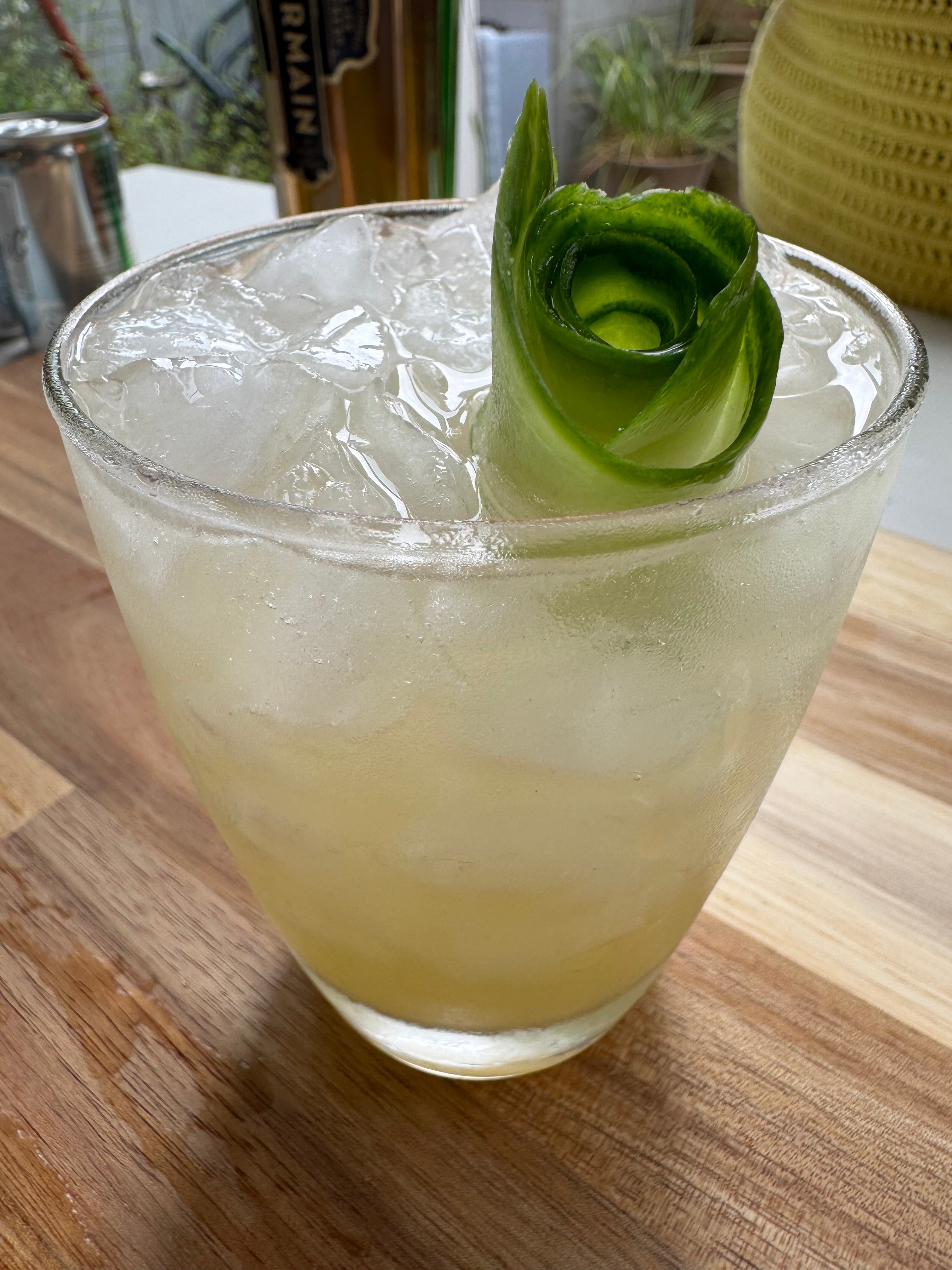 Garnish with: A roll the cucumber into a rose and add to glass.